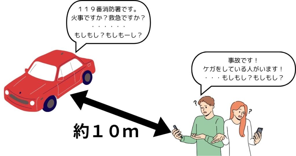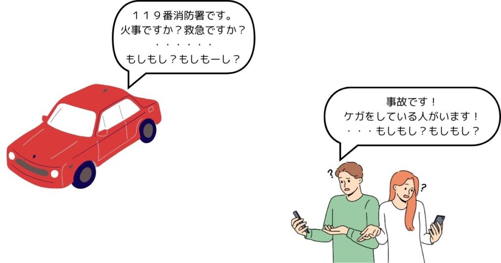 ただ、ナビとスマートフォンのBluetooth接続を解除しないまま車から離れて通報をしてしまうと、こちらの声はナビのマイクでないと届かず、オペレーターの声は車のスピーカーから聞こえるので、電話がつながっているのに話せないので、下の絵のようなことが起きてしまいます。
