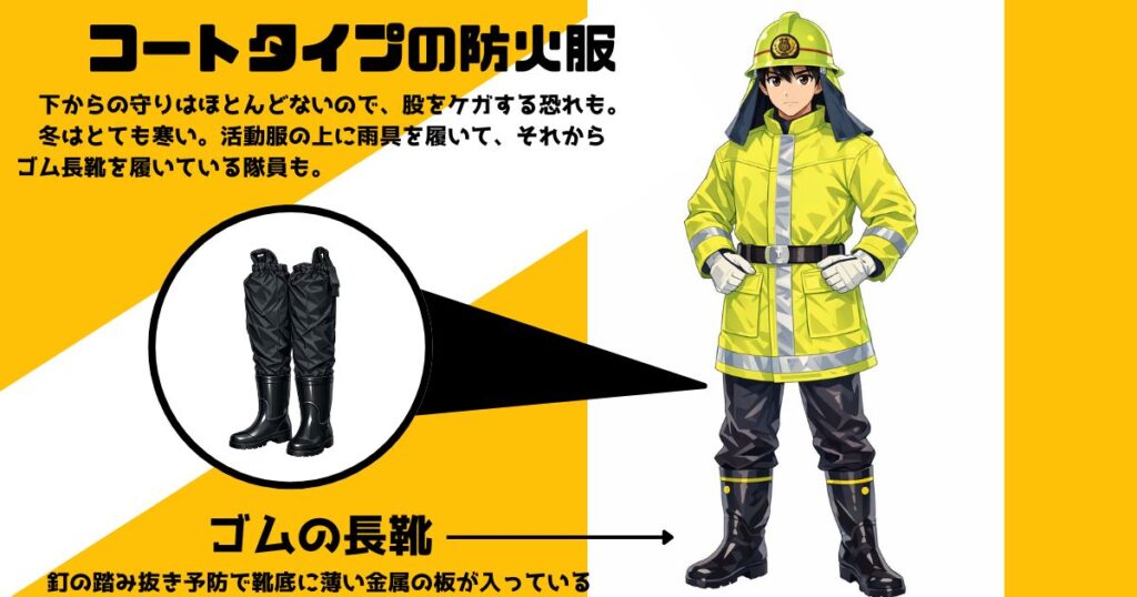 そんなコートタイプは、上着は防火服ですが、下は長靴は、防火長靴とかではなくて、薄い鉄の板が入ったそこらへんに売っているようなゴム長靴です。